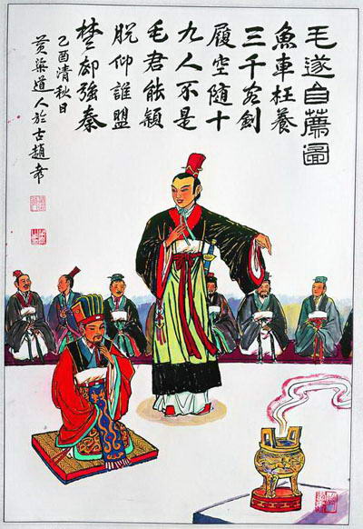 In the Warring States Period, the State of Qin besieged the capital of the State of Zhao. Duke Pingyuan of Zhao planned to ask the ruler of the State of Chu personally for assistance. He wanted to select a capable man to go with him and a man named Mao Sui volunteered. When the negotiations between the two states were stalled because the ruler of Chu hesitated to send troops, Mao Sui approached him, brandishing a sword. After that, the ruler of Chu agreed to help Zhao against Qin.
