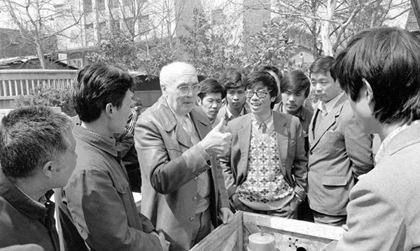 Werner Gerich talks with workers at Wuhan Diesel Engine Factory. [Photo provided to China Daily]