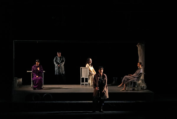Huang Lu (left) and Zhang Ruoyun (front center) star in Lin Zhaohua's The Three Sisters Waiting for Godot, which merges the masterpieces of Anton Chekhov and Samuel Beckett.[Photo provided to China Daily]