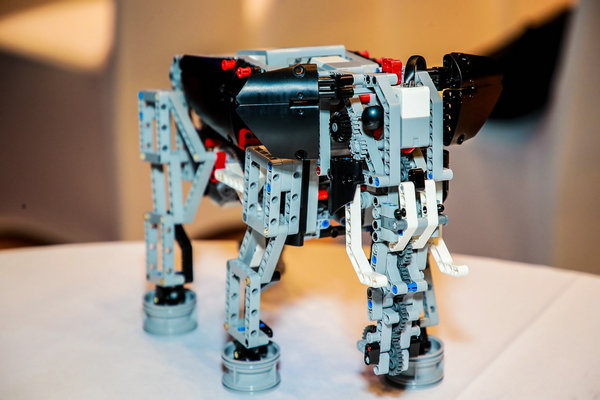 A robotic elephant and monkey that can be manipulated to move by computer-coding orders are shown at the Beijing event. [Photo by Xu Fan/China Daily] |