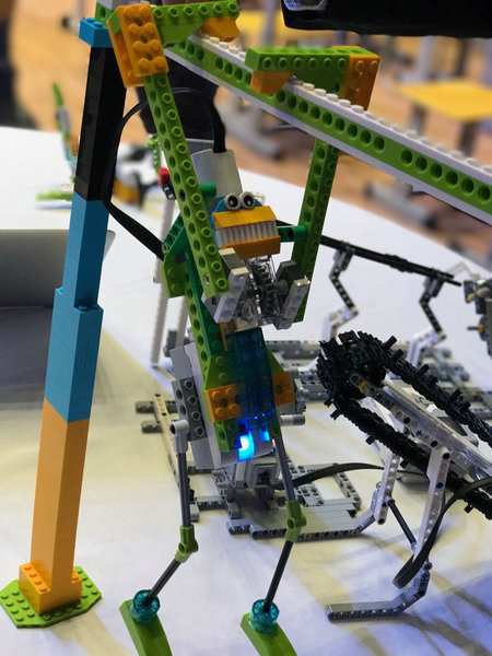 A robotic elephant and monkey that can be manipulated to move by computer-coding orders are shown at the Beijing event. [Photo by Xu Fan/China Daily] |