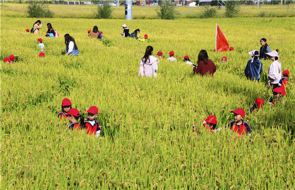 More than 100 children from a kindergarten in Taicang, Jiangsu province, help gather rice under the guidance of their parents and teachers. [Photo by Ji Haixin/For China Daily]