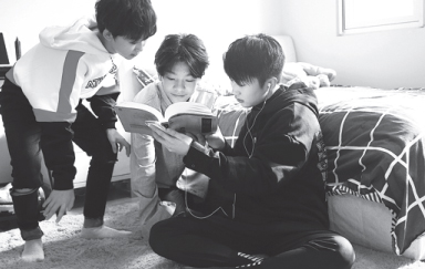 Three members of Boy Story read at a house on the outskirts of Beijing, where they live, study and train. [Photo by ZOU HONG/CHINA DAILY]