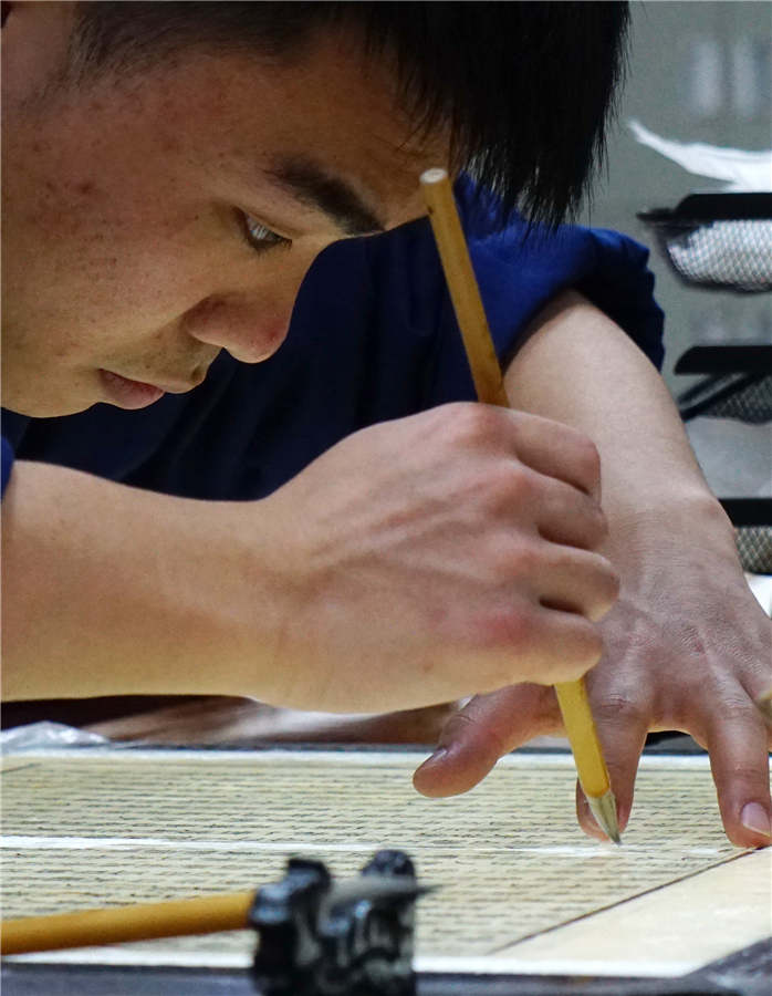 A "doctor" for ancient books brushes paste on a damaged page at a fixing center for ancient books in Chengdu, capital of Southwest China's Sichuan province, Nov 29, 2018. [Photo/Xinhua]