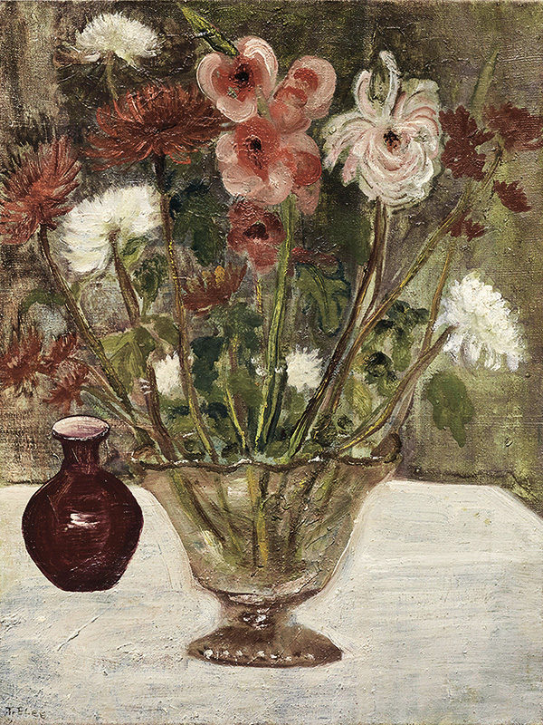 His still life on show, Chrysanthemums, demonstrates refined brushstrokes imbued with Chinese sensibilities. [Photo provided to China Daily] |