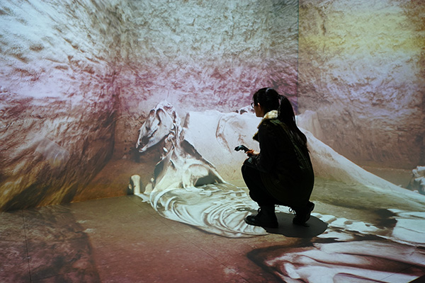 A student examines remains at a simulated excavation site in an immersive virtual-interactive teaching laboratory for archaeology at Northwest University in Xi'an, Shaanxi province, in Northwest China. [Photo provided to China Daily] |