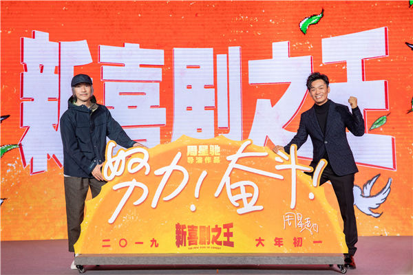Stephen Chow and Wang Baoqiang promote the upcoming comedy The New King of Comedy in Beijing. [Photo provided to chinadaily.com.cn]