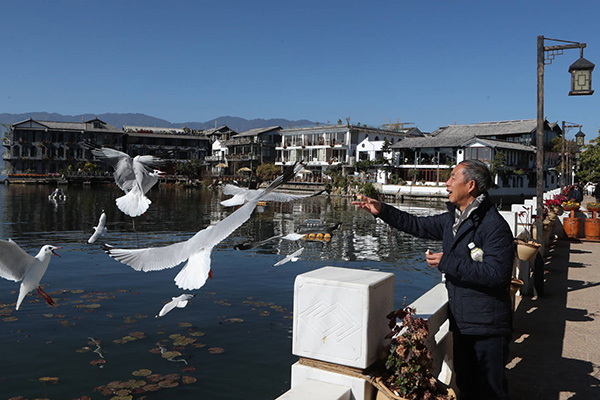 A visitor feeds sea gulls at Erhai Lake in the Dali Bai autonomous prefecture. [PHOTO BY YANG ZHENG/XU JIAN/FOR CHINA DAILY] |