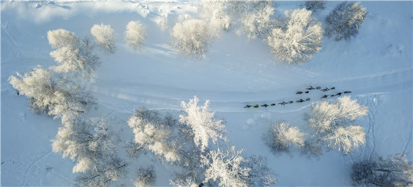 Nine herdsmen travel across the snowfields in the Altay region of Xinjiang. [Photo by Hu Huhu/Xinhua] |