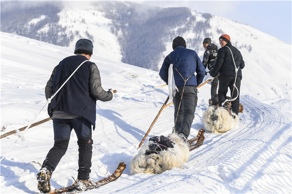 Mamani (right) shouts to his teammates to watch out as they climb a hillside near the Kanas Integrated Nature Landscape Protect Region.