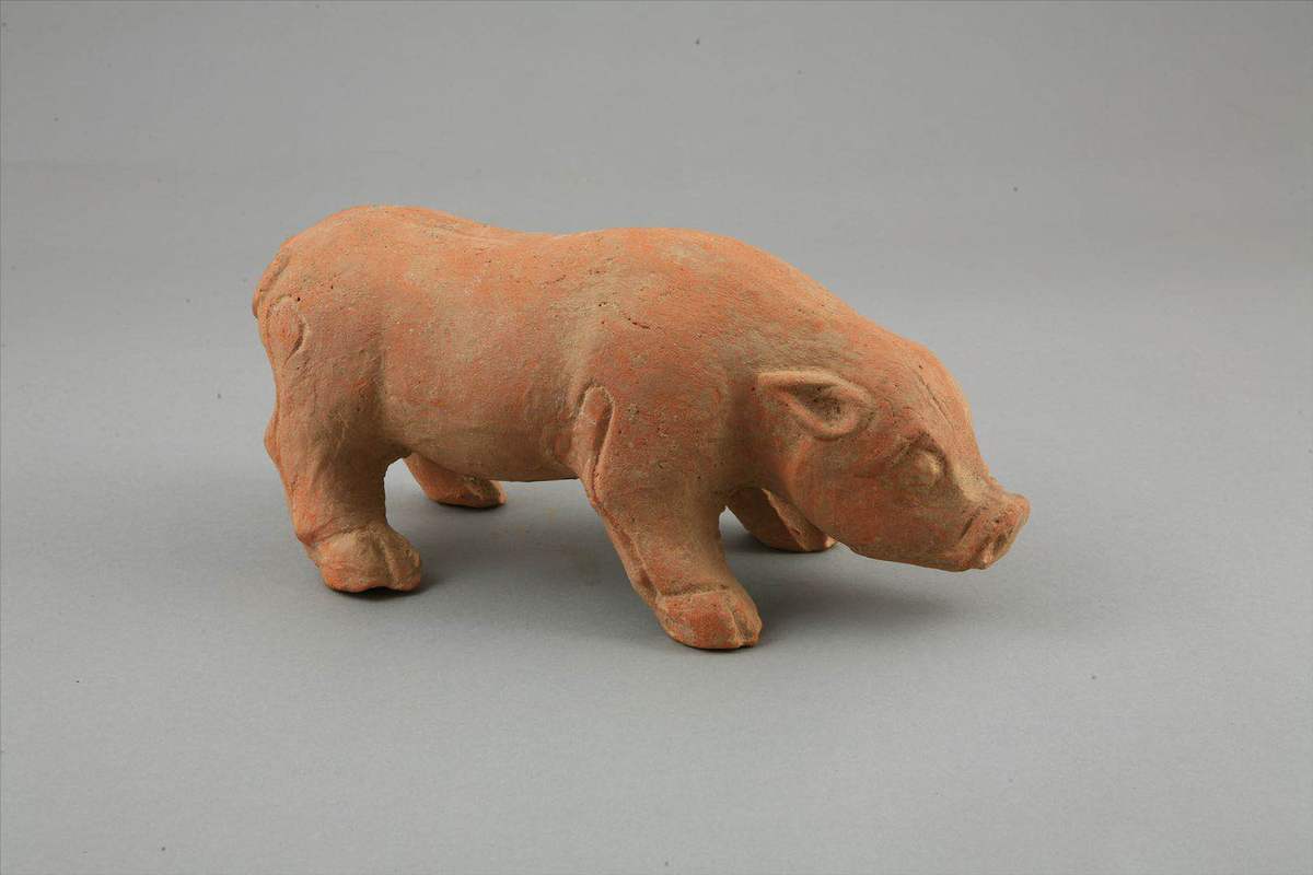 A red pottery pig from the Han Dynasty (206 BC-220 AD), which was discovered in a tomb, is displayed at Chongqing China Three Gorges Museum from Jan 29 to Mar 3. It shows that people were encouraged to raise pigs and that local government had a plan for the local pig industry. [Photo provided to chinadaily.com.cn] |