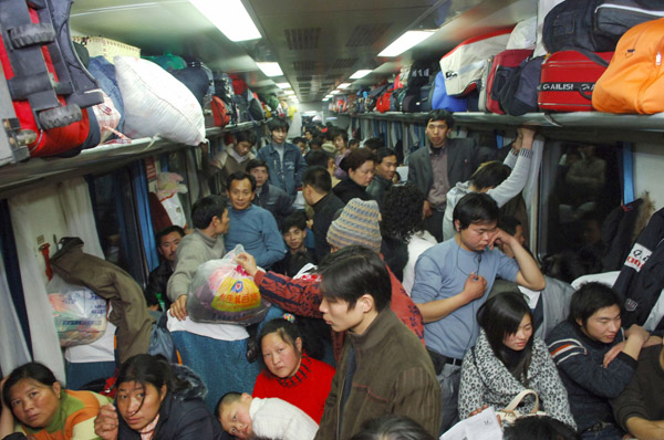 A train packed with passengers in 2007 before that year's Spring Festival holiday. [PHOTO/XINHUA] |