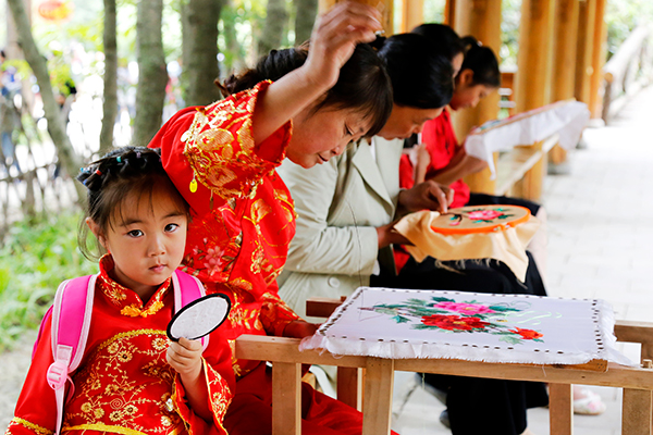 Women in Baoji village of Xihe county, Gansu province, embroider in their spare time to cover some family expenses. [Photo provided to China Daily]