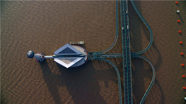A still image from the documentary Aerial China of the Hangzhou Bay Bridge and its offshore platform, once a construction base and now a tourist attraction. [Photo provided to China Daily] |