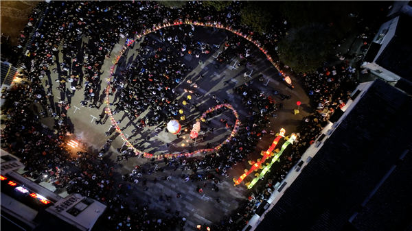 Villagers in Zhejiang province perform bandenglong, a traditional celebration in which wooden benches fitted with lanterns are used to simulate the movements of a dragon. [Photo provided to China Daily] |