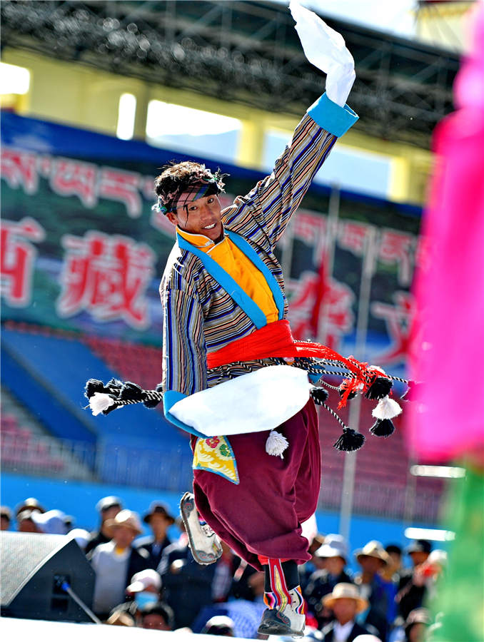 An artist from Zha'nang county performs Tibetan Opera during a cultural festival in Shannan, Southwest China's Tibet autonomous region, Aug 17, 2019. [Photo/Xinhua]