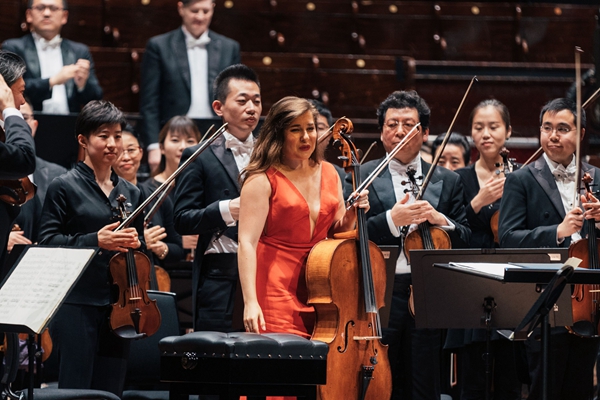 US cellist Alisa Weilerstein plays with the Shanghai Symphony Orchestra during a performance of Dvorak's Cello Concerto in B minor at the Edinburgh concert on Monday.[Photo provided to China Daily] |
