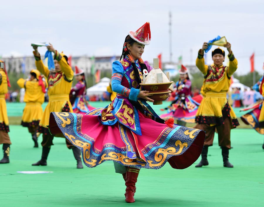 An artist of Ulan Muqir performs at the opening of the eighth Ulan Muqir Arts Festival in Alshaa Left Banner in Alshaa League, North China's Inner Mongolia autonomous region, Aug 20, 2019. The nine-day festival brings together 22 Ulan Muqir art troupes from places including Inner Mongolia, Gansu, Qinghai and Xinjiang, showcasing outstanding works created by Ulan Muqir artists in recent years. Ulan Muqir, or Red Bud Troupe, is the Mongolian name for a troupe that travels from one grazing site to another, performing for herdsmen who live in some of China's most remote areas. [Photo by Ding Genhou/Asianewsphoto]