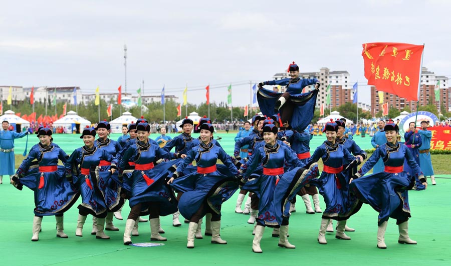 Artists of Ulan Muqir perform at the eighth Ulan Muqir Arts Festival in Alshaa League, North China's Inner Mongolia autonomous region, Aug 20, 2019. [Photo by Ding Genhou/Asianewsphoto]