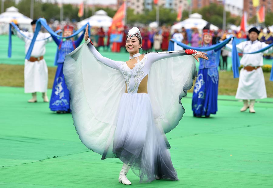 An artist of Ulan Muqir performs at the eighth Ulan Muqir Arts Festival in Alshaa League, North China's Inner Mongolia autonomous region, Aug 20, 2019. [Photo by Ding Genhou/Asianewsphoto]