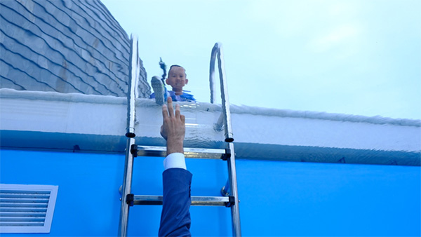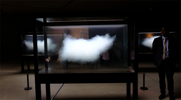Entering the museum, visitors are soon lost in Erlich's parallel universe, where an uprooted building hangs in midair, clouds float in a dark room, and fully clothed people chat and walk underwater in a pool.