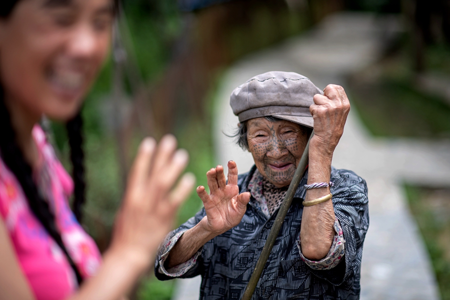 At the 3,000-meter-high Xiaochala Derung village, a tattooed woman greets Guan Yanping.[Photo by Zhang Ziwang/Zheng Yijian/Nan Fang/China Daily]