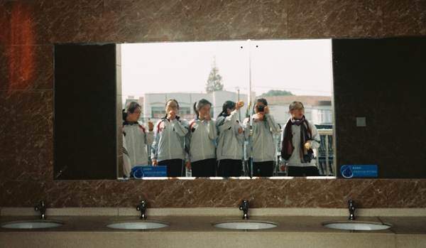 Girls eat apples during a lunch break, reflected in a restroom mirror.[Photo provided to China Daily] |