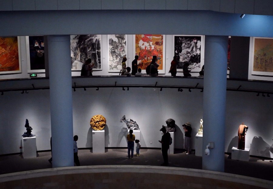 Visitors view artworks at the International art invitational exhibition of contemporary Silk Road at Shaanxi province Art Museum in Xi'an, northwest China's Shaanxi province, Sept 7, 2019. The exhibition featuring artworks from over 110 countries and regions kicked off on Saturday.[Photo/Xinhua]