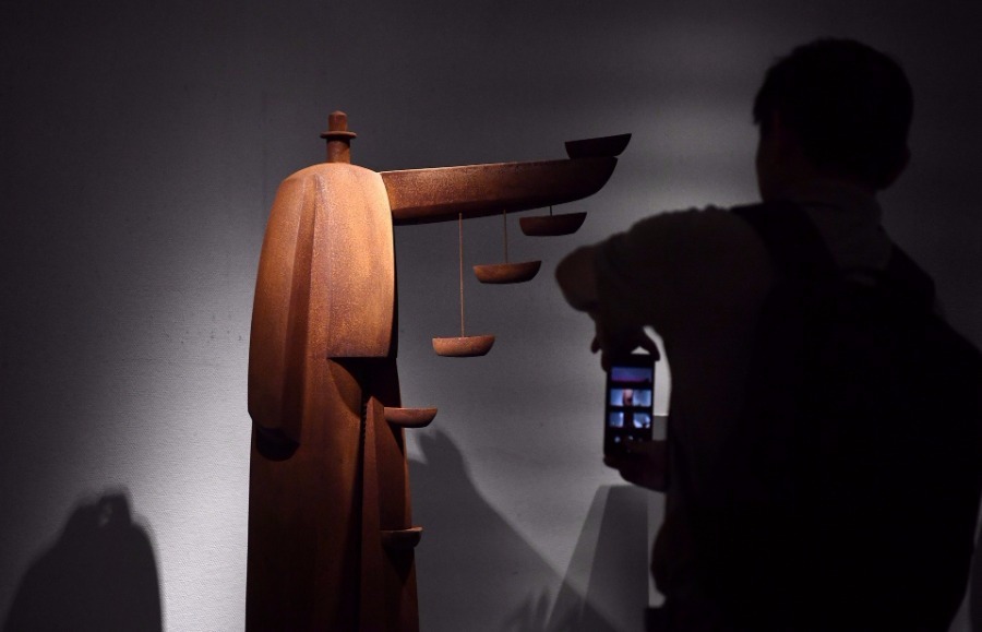 A visitor takes photos of an artwork at the International art invitational exhibition of contemporary Silk Road at Shaanxi province Art Museum in Xi'an, northwest China's Shaanxi province, Sept 7, 2019. The exhibition featuring artworks from over 110 countries and regions kicked off on Saturday.[Photo/Xinhua]