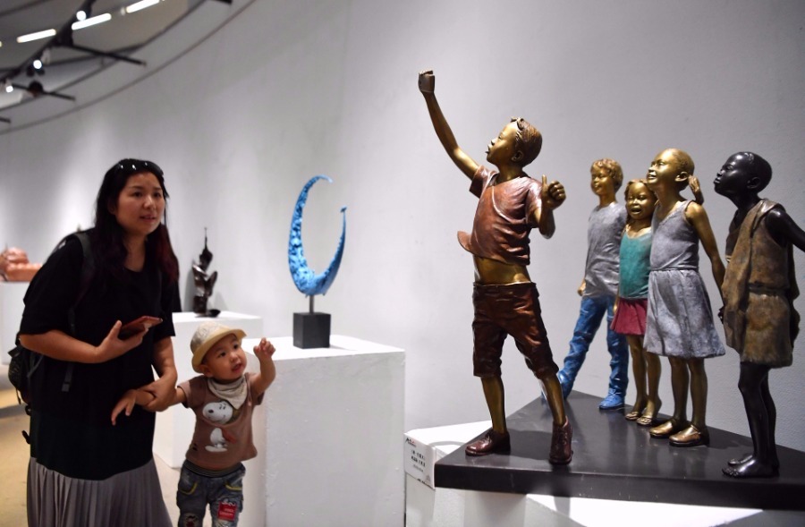 Visitors view artworks at the International art invitational exhibition of contemporary Silk Road at Shaanxi province Art Museum in Xi'an, northwest China's Shaanxi province, Sept 7, 2019. The exhibition featuring artworks from over 110 countries and regions kicked off on Saturday.[Photo/Xinhua]