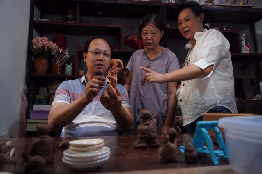 He Bin(L) discusses clay works with his apprentices at his studio in Nanjing, capital of East China's Jiangsu, Sept 8, 2019. He Bin, 43, is an inheritor of Nanjing clay figurines, a provincial-level intangible cultural heritage in Jiangsu. Besides teaching his apprentices, He Bin also holds classes for students and develops some cultural and creative products of Nanjing clay figurines, as an effort to promote the traditional skills.[Photo/Xinhua]
