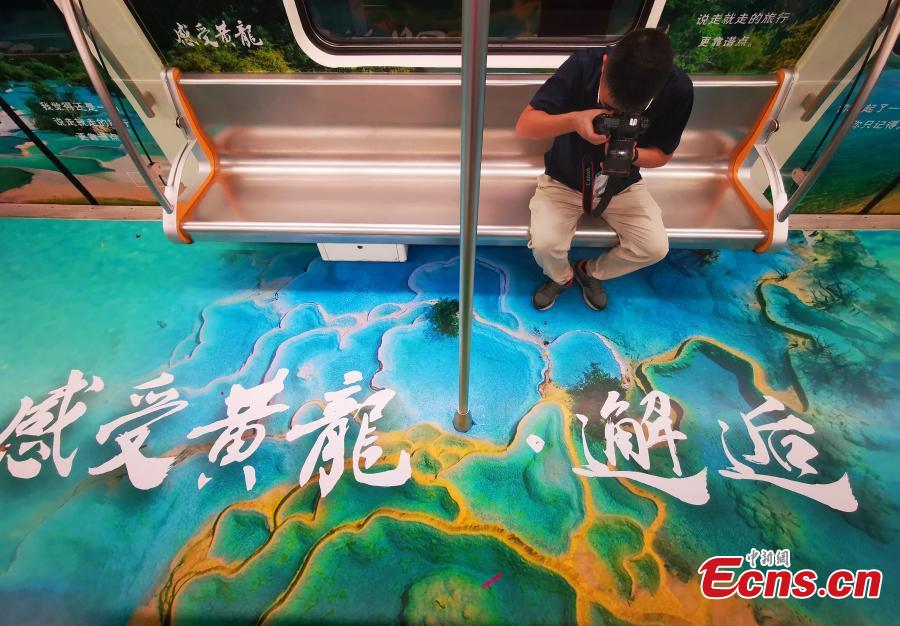 A Chengdu Metro train with an interior featuring the Huanglong Scenic and Historic Interest Area is seen in Chengdu city, Sichuan province, Sept 9, 2019. Huanglong, a UNESCO World Heritage site, is home to snow-capped peaks and the easternmost Chinese glacier. In addition to its mountain landscape, diverse forest ecosystems can be found, as well as spectacular limestone formations, waterfalls and hot springs. [Photo/China News Service] |