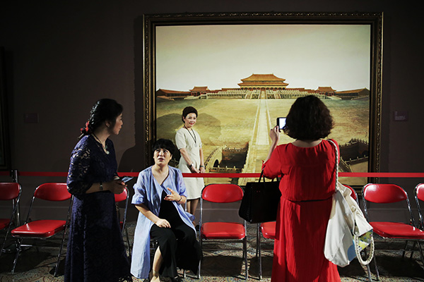 An exhibition displaying 150 representative works by veteran oil painter Jiang Guofang opened on Saturday in the Palace Museum in Beijing. [Photo by Jiang Dong/China Daily]