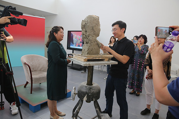 Li Yinhuan, a teacher who has for the past three decades been devoted to the education of students with intellectual disabilities, poses while a sculptor works on her statue. [Photo by Jiang Dong/China Daily]