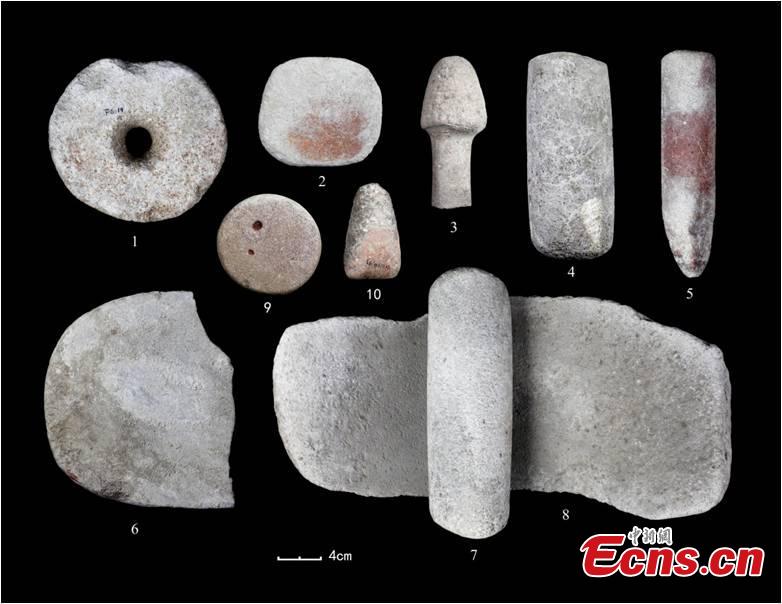 Relics found during an archaeological excavation at the Simagou ruins in Huade county, Northwest China's Inner Mongolia autonomous region. Bao Qingchuan, a researcher with the Inner Mongolia Autonomous Region Institute of Archaeology, said the remains have been radiocarbon dated to approximately 7000-9000 years ago. [Photo provided to China News Service]