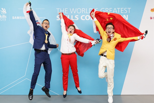 Zhang Ziyang (right) celebrates with fellow medalists after winning the bronze medal in baking at the 45th WorldSkills Competition in Kazan.[Photo provided to China Daily] |