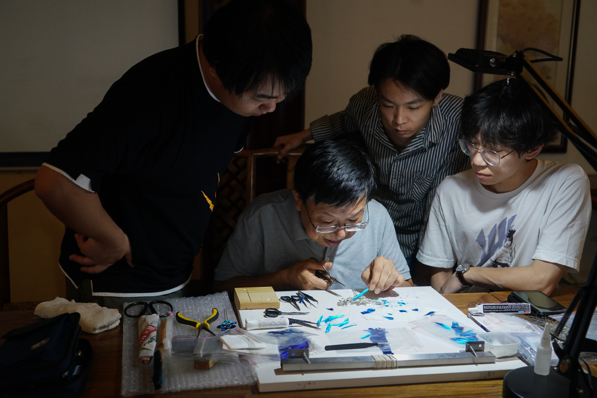 Zhao Shuxian (2nd L) instructs his apprentices Ling Jiawei (1st L), Fu Lei (2nd R) and Yan Xin to make velvet flower handicrafts at the workshop of Nanjing Intangible Cultural Heritage Exhibition Center in Nanjing, capital of East China's Jiangsu province, Sept 14, 2019. [Photo/Xinhua]