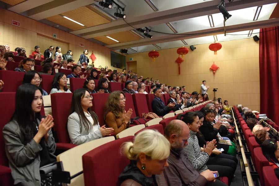 Audience members watch dancers from the Shanghai Ballet perform at The Glamour of Dance at the China Cultural Center in Brussels on Sept 9, 2019. [Photo/Chinacutlure.org]