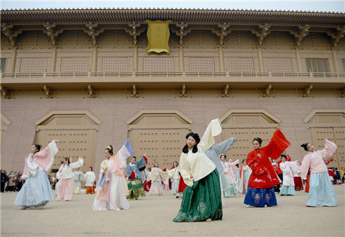 People wear hanfu, traditional Chinese attire, during an event in Xi'an, Northwest China's Shaanxi province, on November 24, 2018. [Xinhua] |