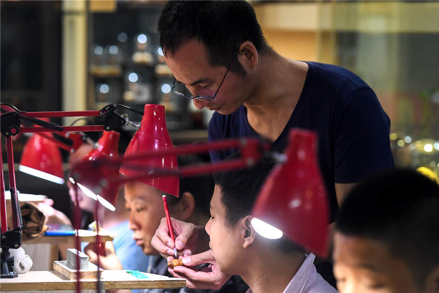 Ma Luocheng (Up) teaches his apprentices fruit pit carving skills in Changsha, Central China's Hunan province, Sept 18, 2019. [Photo/Xinhua]