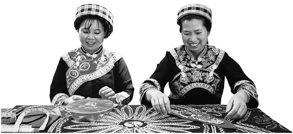 Female embroidery workers present their works in Beijing to protect and promote traditional ethnic embroidery that is disappearing. [Photo provided to China Daily] |