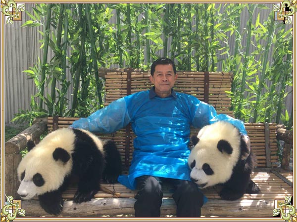 Korn Dabbaransi takes photos with pandas. [Photo provided to chinadaily.com.cn] |
