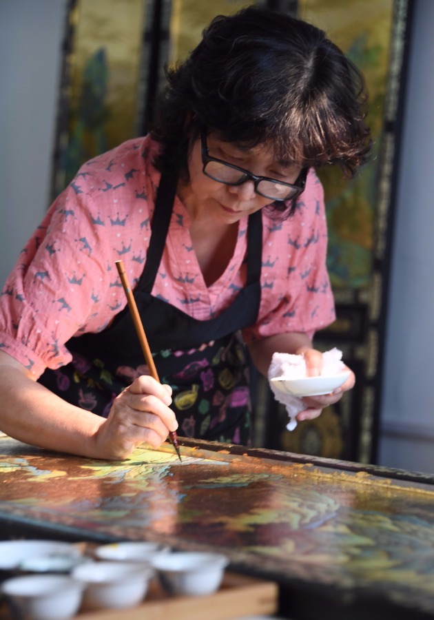 Hu Xin works on a gold lacquer painting at Beijing Gold Lacquer Inlaid Co., Ltd. in Beijing, capital of China, Sept 19, 2019. Gold inlaid lacquer, an integral part of painted and inlaid lacquer, is among the eight Beijing-style handicrafts. Gold inlaid lacquer ware combines the intricate skills of carving, filling, whetting, inlaying and painting. It features a gold lacquered surface inlaid with various gems and other exotic materials. Hu Xin, a 62-year-old senior arts and crafts master of Beijing, has been dedicated to designing and creating lacquer wares for about 43 years. The art has received a new lease on life thanks to the efforts made by Hu to innovate technical methods, especially in gold lacquer inlaid painting techniques. Dozens of her gold inlaid lacquer works have received a series of accolades at home and abroad, including gold award of the Hundred Flowers of Chinese Arts and Crafts. To better promote the art, Hu has trained ten apprentices, some of whom have been recognized as the representative inheritors of gold lacquer inlaid painting techniques. Apart from that, she has been committed to passing on the craft since 2015 by teaching students gold lacquer inlaid production techniques in a specialist course jointly launched by Beijing Gold Lacquer Inlaid Co., Ltd. and Beijing Senior Technical School of Arts and Crafts.[Photo/Xinhua] |
