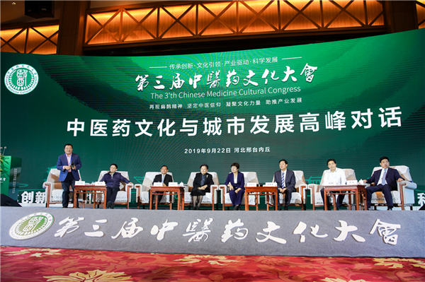 A dialogue on TCM culture and city development is held during the third Chinese Medicine Cultural Congress in Neiqiu county, Xingtai city, Hebei province, Sept 22, 2019. [Photo provided to chinadaily.com.cn] |