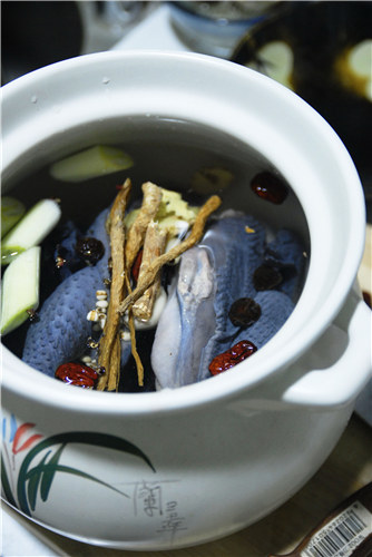 Black chicken soup with dried angelica root and jujubes. [Photo provided to China Daily] |