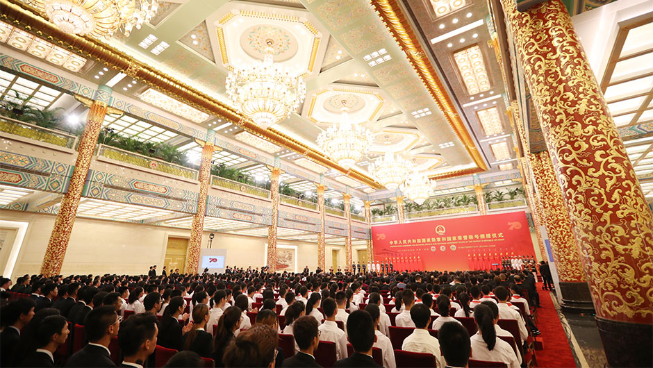 A ceremony is held to grant national medals and honorary titles of the People's Republic of China at the Great Hall of the People in Beijing on Sept 29, 2019. [Photo/Xinhua]