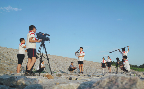 Students and two teachers shoot their film on a local rock beach in Neiqiu, Hebei province. [Photo/Xinhua]