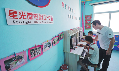 A professional post-production staffer helps students edit film clips. [Photo/Xinhua]