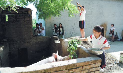 A girl feeds a pig with leaves as one of the scenes of their miro-movie. [Photo/Xinhua]