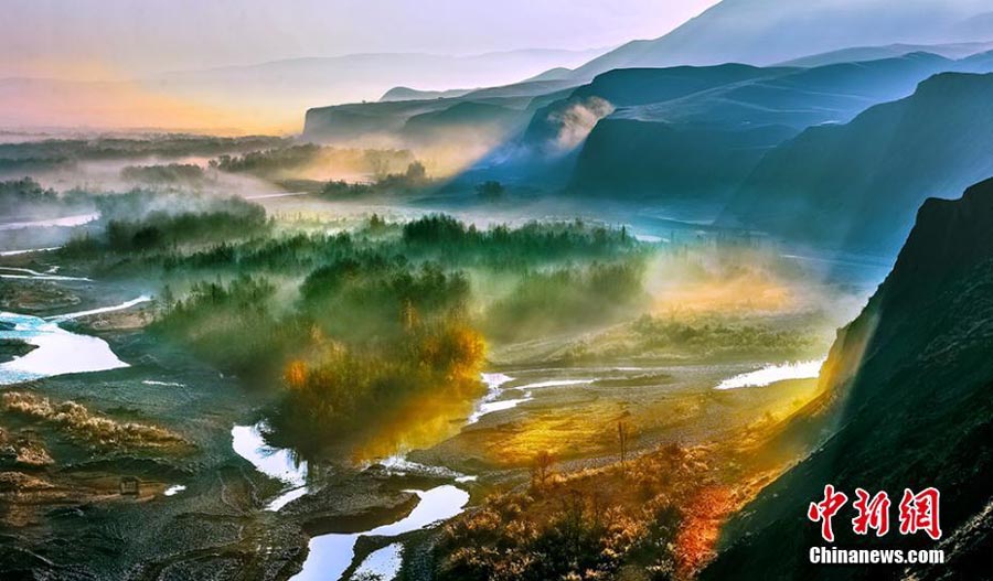 Stunning autumn scenery is pictured in the river valley in Nilka county, Ili Kazak autonomous prefecture, Northwest China's Xinjiang Uygur autonomous region, Oct 10, 2019. Shrouded in the morning sun, the valley's endless forest becomes colorful during mid-autumn. [Photo/Chinanews.com]